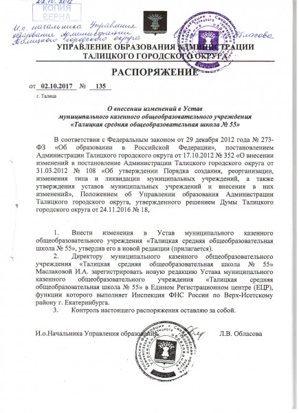 Устав 2017г..output.pdf Документ подписан электронной подписью Серийный номер 603332450510203670830559428146817986133868575882 Директор Маслакова Ирина Афонасьевна Дата подписания документа 07.10.2021 08:41:30 (скачать) (посмотреть)